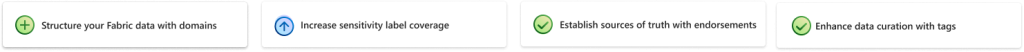 Para facilitar la mejora continua del gobierno del dato, OneLake catalog propone un conjunto de acciones concretas orientadas a los administradores de Fabric. Estas recomendaciones no se limitan a mostrar el estado actual, sino que guían activamente sobre qué medidas tomar para reforzar el control y la calidad de los datos.